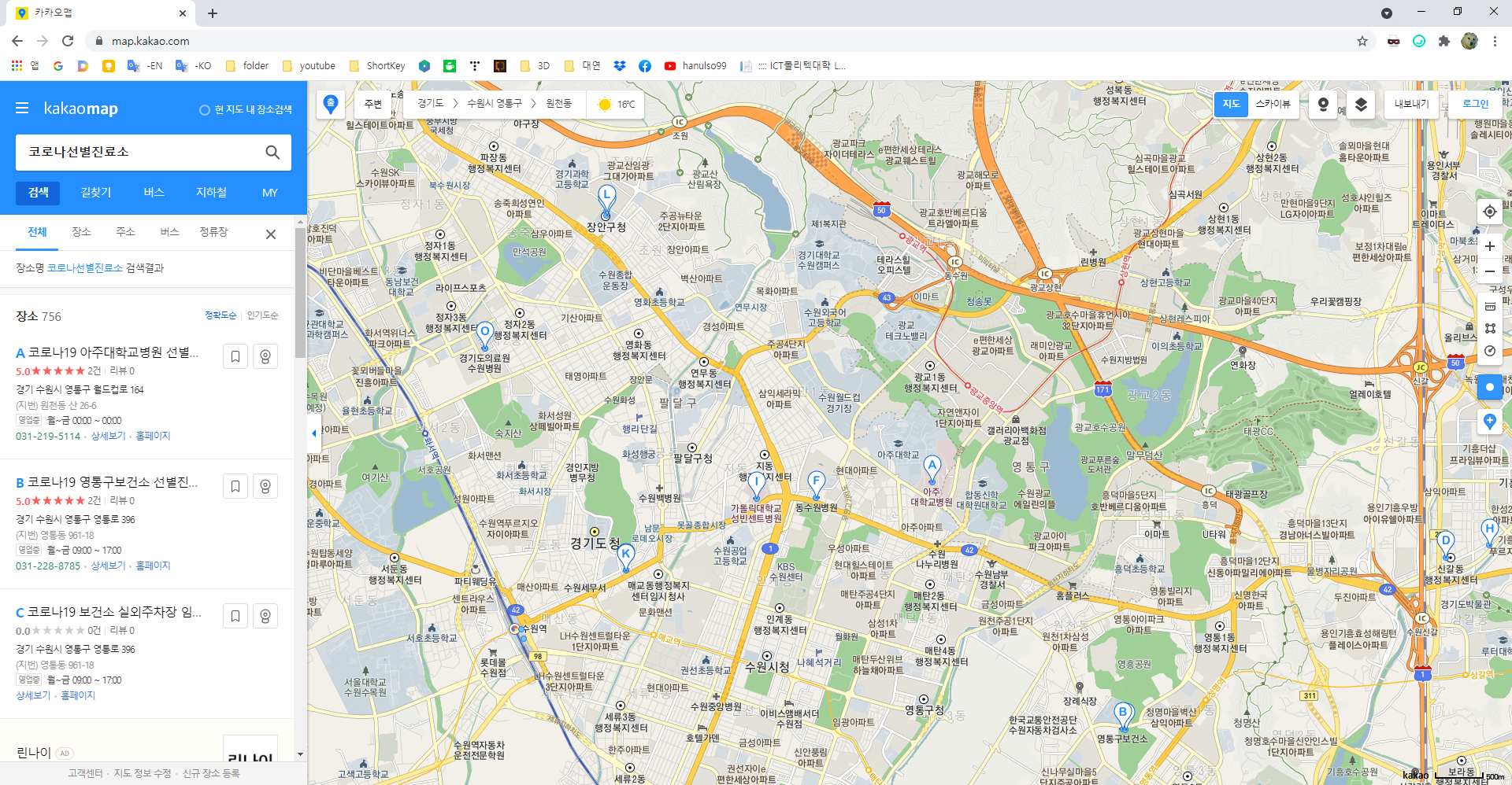 지도에서 '코로나선별진료소'를 검색하면 아래와 같이 나옵니다.