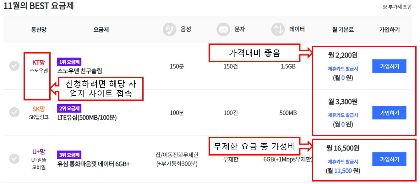 가장 쉬운 방법은 알뜰폰 가격비교 사이트를 이용하는 것입니다.