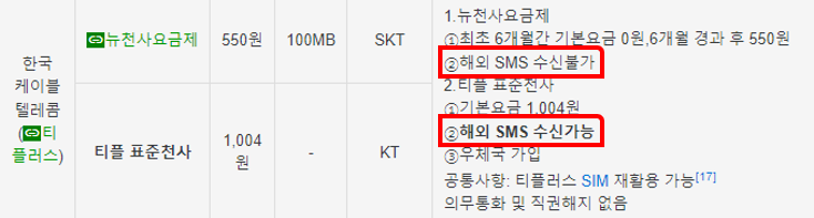 또한 일부 요금제는 해외 SMS 수신 불가한 경우가 있습니다. 제가 볼 때 이런 조건은 월 1,000원 미만의 요금제만 해당되는 것 같습니다.
