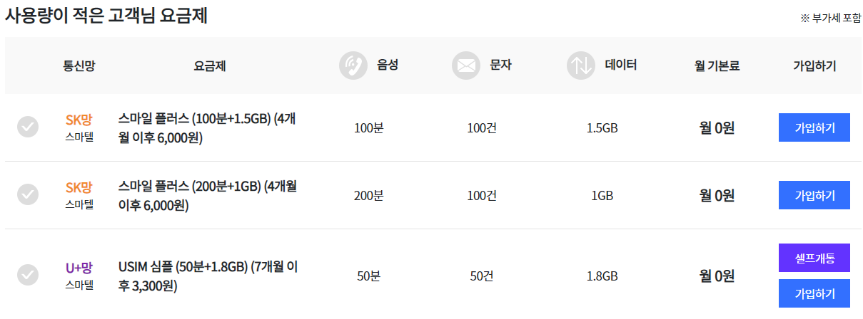 0원 요금제를 찾으실 경우 '사용량이 적은' 에서 찾아보시면 됩니다.