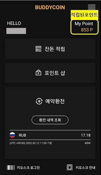 그리고 앱에서 아래 메뉴를 사용하여 1150원을 적립하면 2000P가 완성됩니다.