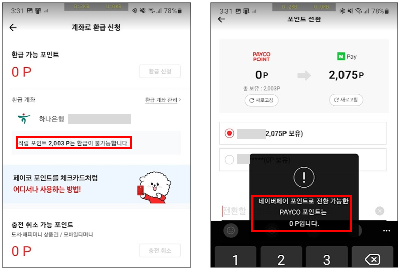 환급이 불가능한 PAYCO 적립포인트는 결재시에 사용하는 수밖에 없습니다.