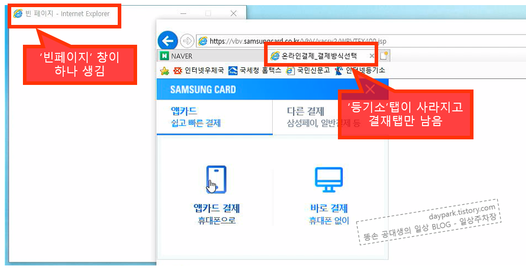 아래와 같이, 카드결재 창이 뜰때 기존의 창이 사라지지 않으면 정상적으로 적용된 것입니다.
