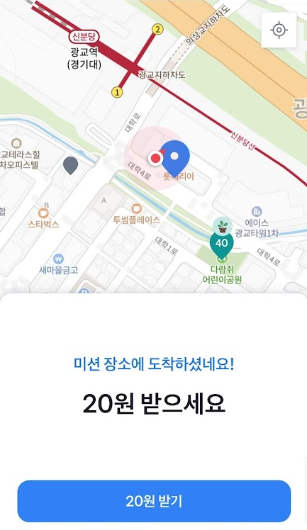 출근길은 토스앱의 '주변장소가기'에 집중합니다. '주변장소가기'는 앱에서 지정하는 특정 위치로 이동하면 GPS로 위치를 파악하여 포인트를 지급하는 기능입니다. 특별한 날에는 지급하는 포인트가 늘어나기도 하고, 어떤 경우엔 미션 장소에서 사용할 수 있는 쿠폰을 주기도 합니다. 물론 해당 위치에 도달했을때 나오는 버튼을 눌러야만 포인트가 적립됩니다.