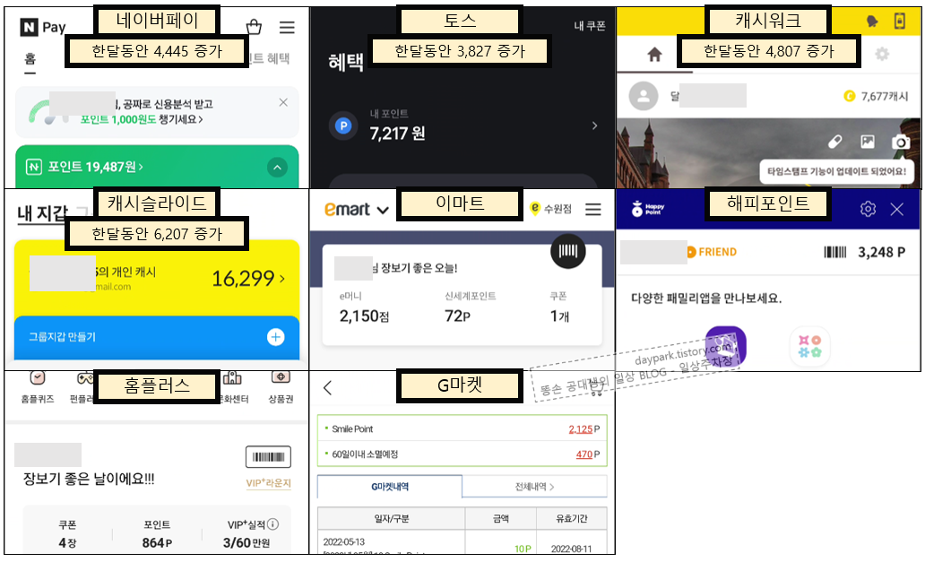- 두달째 - 포인트 링크 모음을 많이 함. 캐시워크 퀴즈풀이함. 회원가입은 더이상 하지 않음.