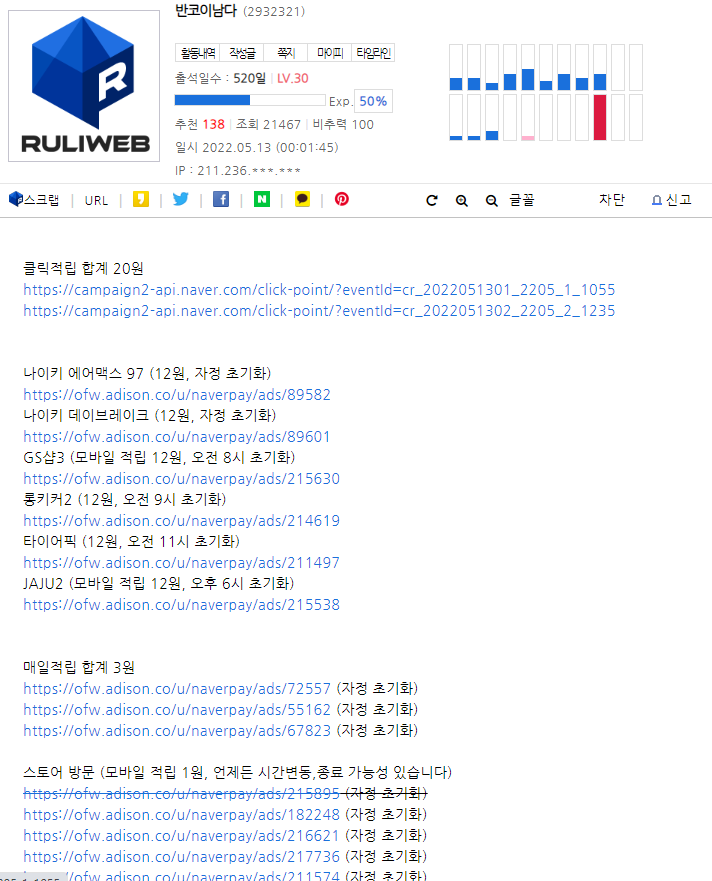 그러던 중에 '8달에 20만원 벌었어요' 라는 글을 우연히 보면서 충격을 받고 열심히 하게 되었습니다. 포인트 모으는 링크 사이트를 알게 되니 일이 훨씬 수월해지더군요.