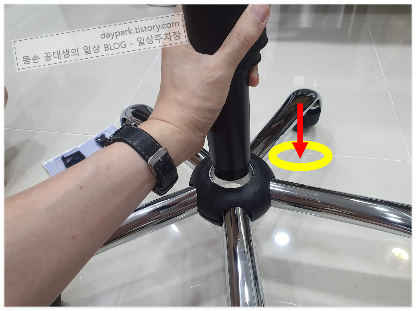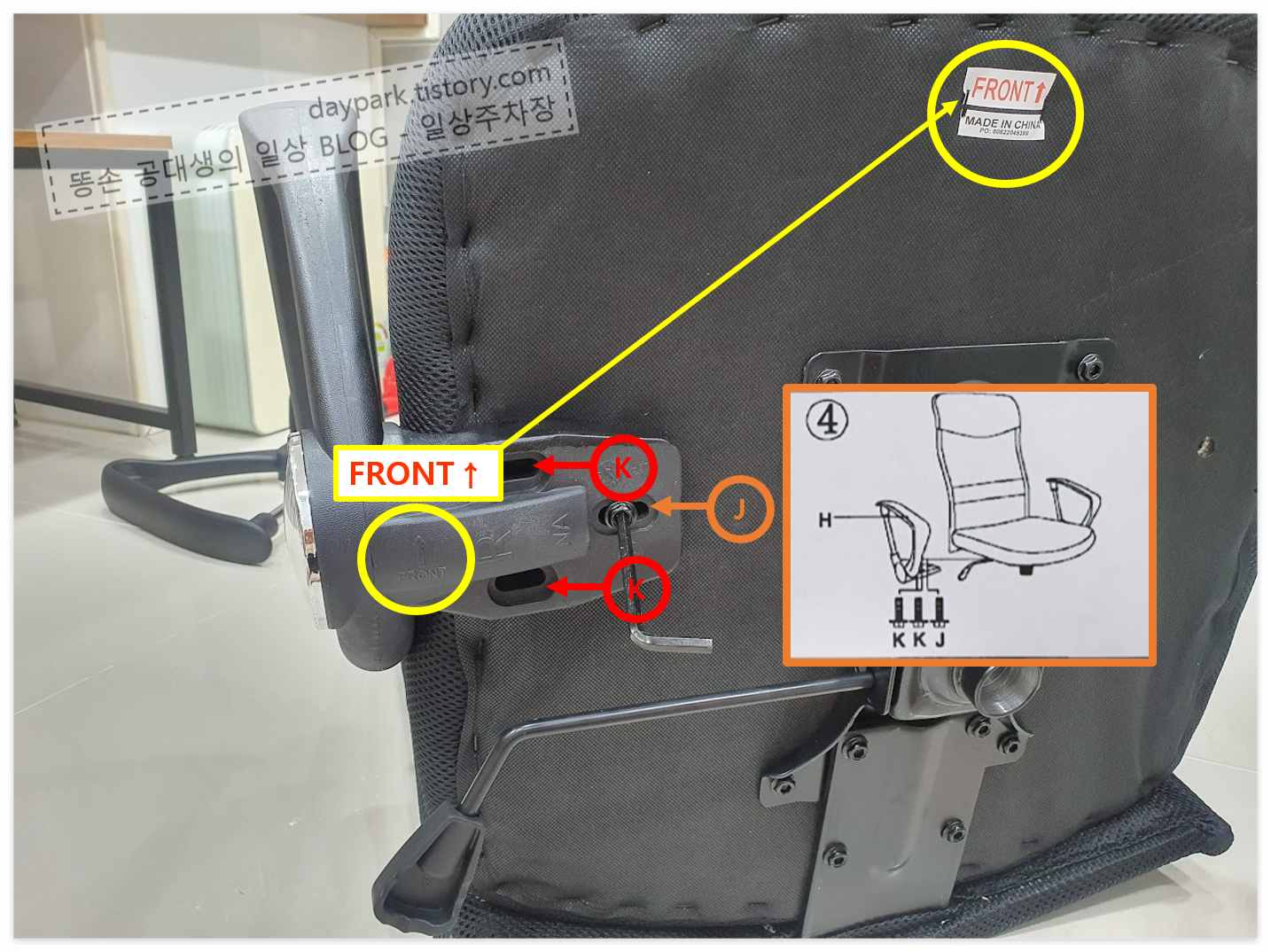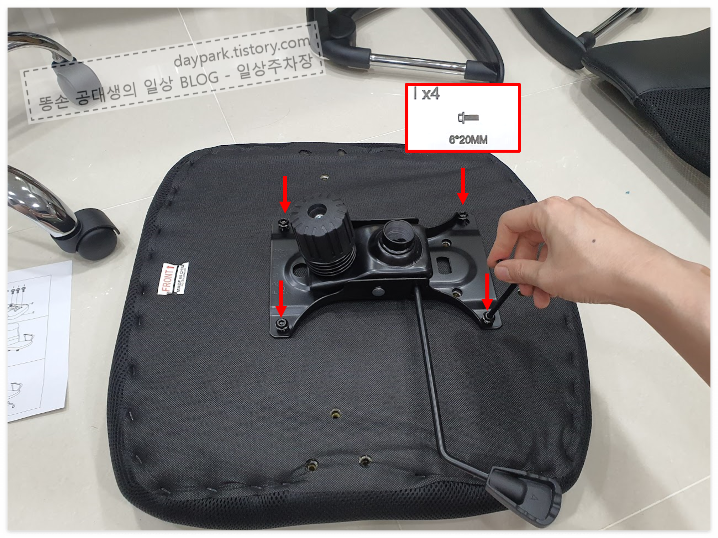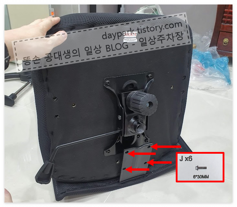 양쪽 팔걸이를 조립합니다. 팔걸이의 방향과 나사의 종류에 주의하세요!!!