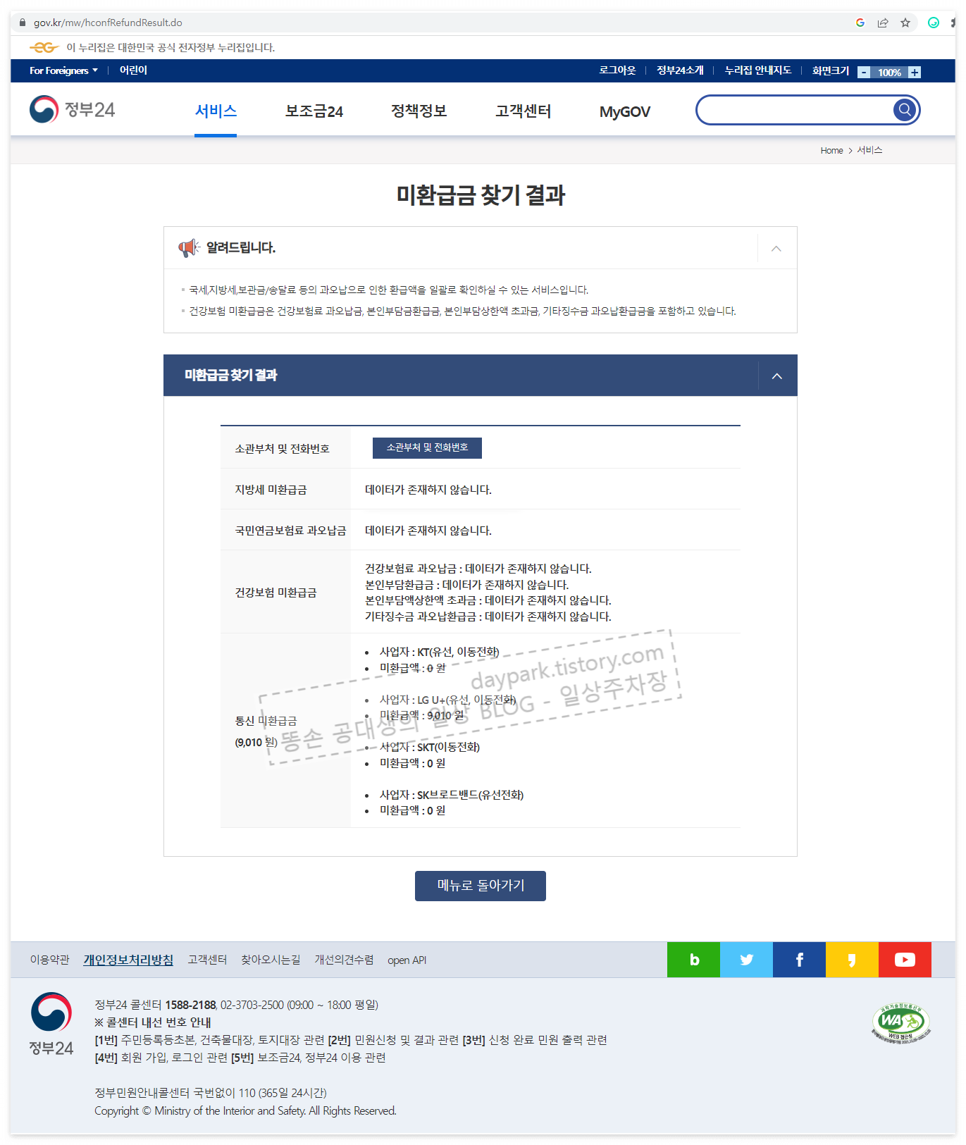 조회 버튼을 누르면, 아래와 같이 결과가 나옵니다. 통신요금 관련한 미환급금을 찾았습니다.