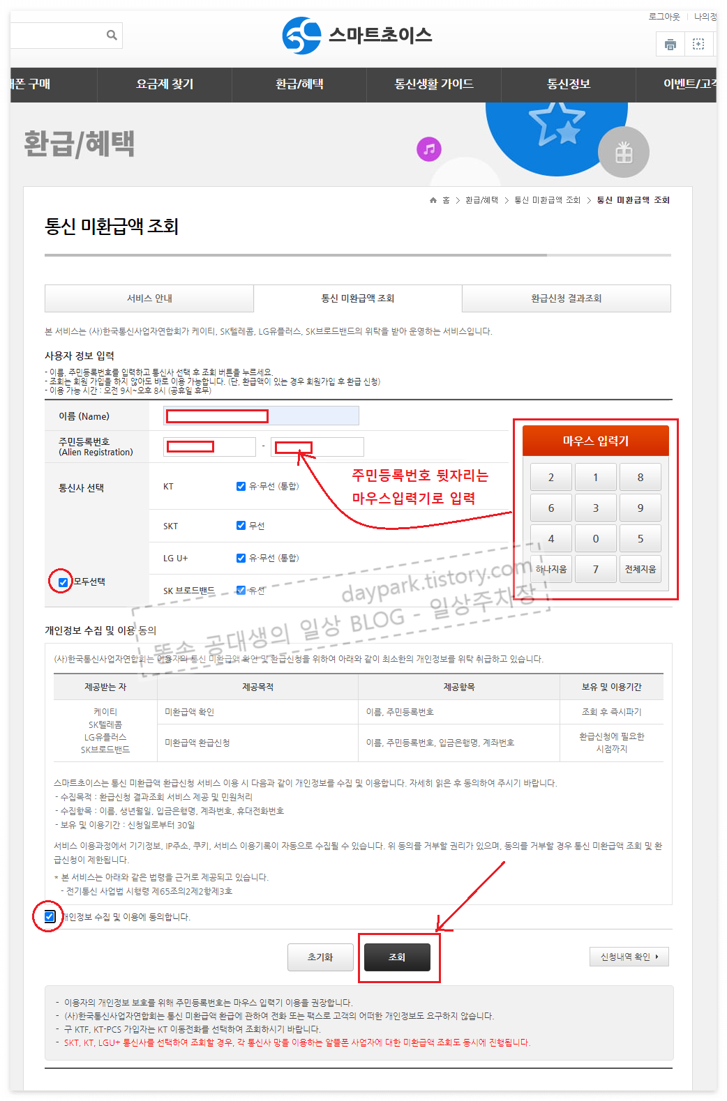 필요한 정보를 입력합니다. 주민등록번호를 입력할 때 마우스 입력기를 사용해주세요.