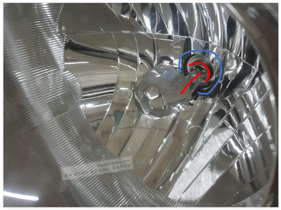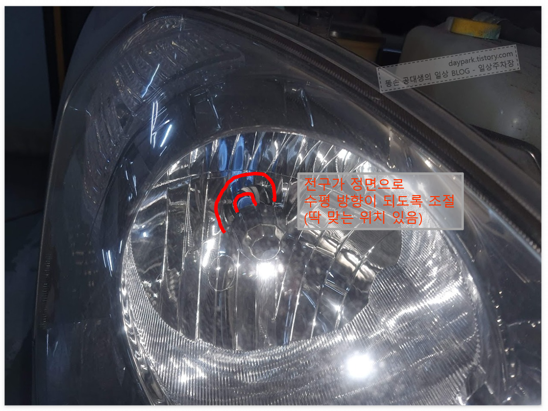 새 전구의 위치를 잡을 때는, 헤드라이트를 보면서 하시면 됩니다. 살살 돌려가면서 위치를 잡다보면 딱 맞는 곳이 있습니다.