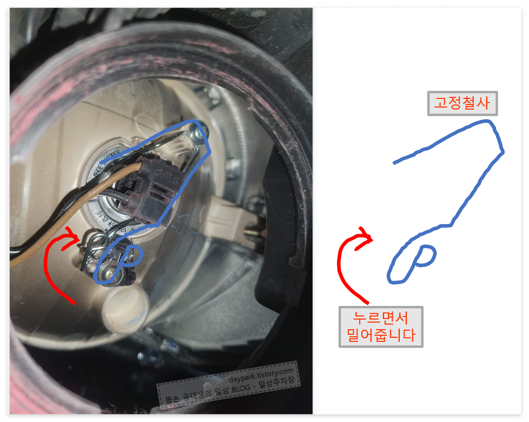 라이트를 보면서, 전구 위치를 잡고 고정철사를 고정해 줍니다. 조수석쪽과 동일하므로 자세한 설명은 생략합니다.