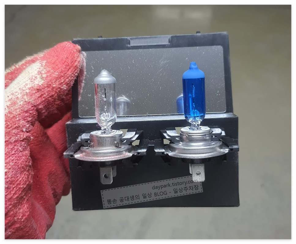 왼쪽이 교체한 전구, 오른쪽이 새 전구입니다. 전구의 파란색은, 조명의 색온도를 높이기 위해 (흰색으로 보이게 하기 위해) 색을 넣은 것이라고 합니다.