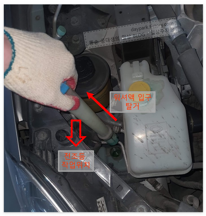 워셔액 입구를 꽂아서 마무리합니다.