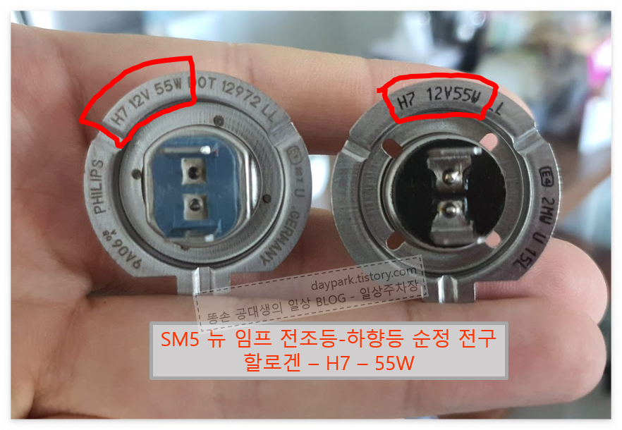 인터넷을 검색하면 너무나도 많은 종류의 차량용 전구가 있습니다. 뉴SM5에 사용되는 전조등 기본 규격은, H7에 55W 입니다. 오늘 첫 셀프교체한 (순정) 전구를 보여드립니다. 좌우가 다른 전구를 사용하네요 ㅎㅎㅎㅎ