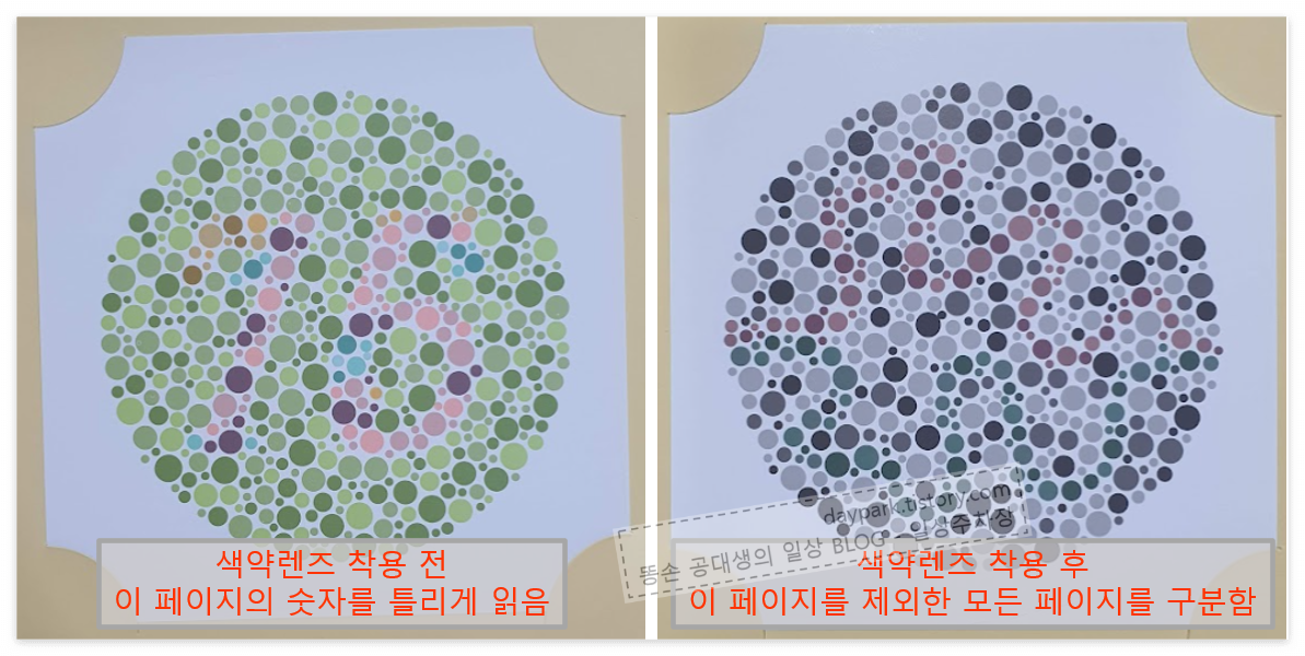 착용 후 보정된 색이 눈에 익숙해지도록, 색맹 검사지를 보면서 연습을 해야 합니다. (검사지를 외우라는 말이 아닙니다) 렌즈를 착용하고 연습해본 조카의 말로는, 색 구분이 확실히 좋아졌다고 합니다. 다만 완전히 정상인만큼의 색을 구분하지는 못했습니다. 색약 검사지의 가장 마지막 페이지의 색은 구분하지 못하더군요.