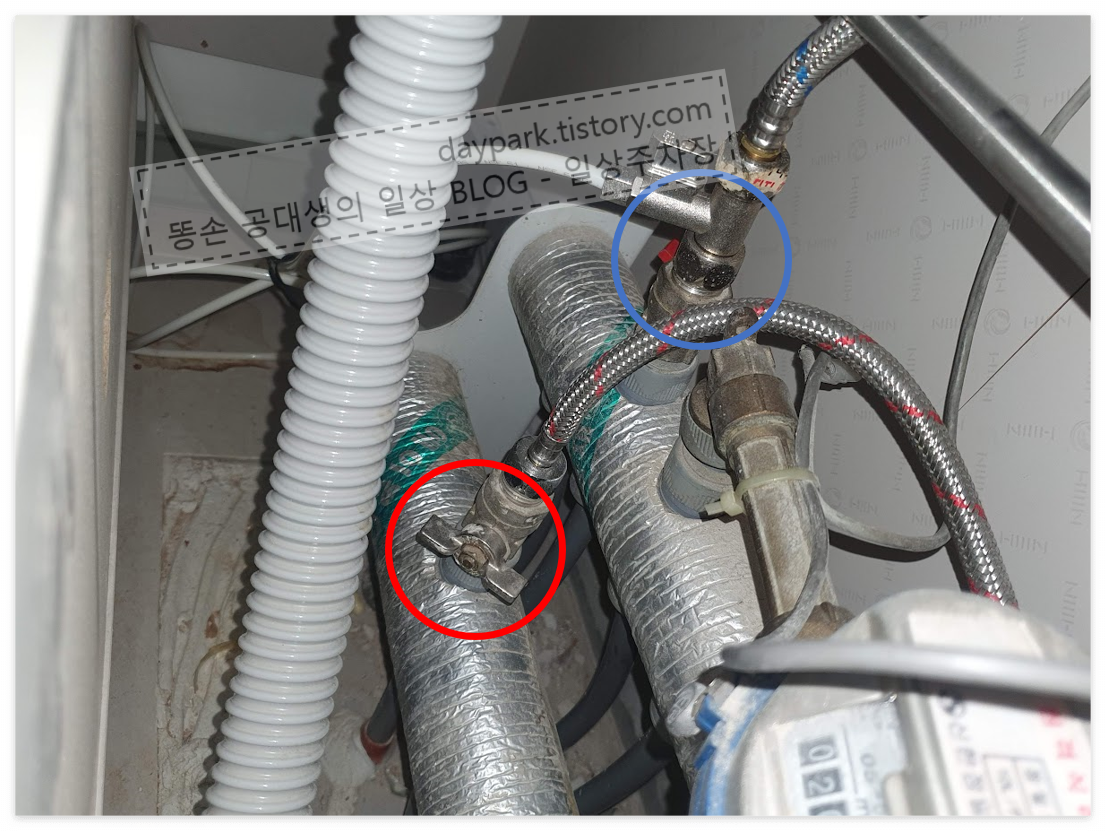 수전이 설치된 싱크대 안쪽을 보면, 물이 들어오는 밸브가 있습니다. 온수와 냉수 모두 잠급니다.
