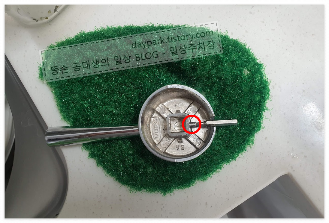 손잡이를 제거하면 이렇게 생겼습니다. 표시한 캡은 기스가 나지 않도록 손으로 돌려서 분해해 주세요.