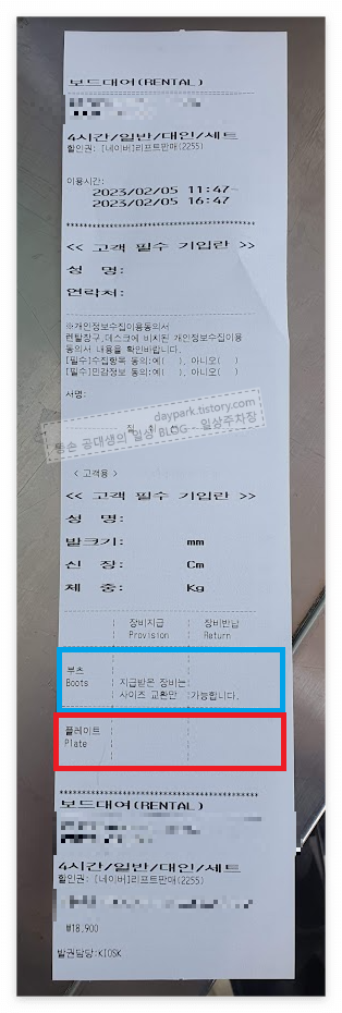 영수증을 가지고 대여샵에 가면, 빌리지 않는 쪽에 X표시를 하고 필요한 것만 빌려줍니다. 여기까지만 신경쓰면 되고 나머지는 일반 대여 절차와 동일합니다.