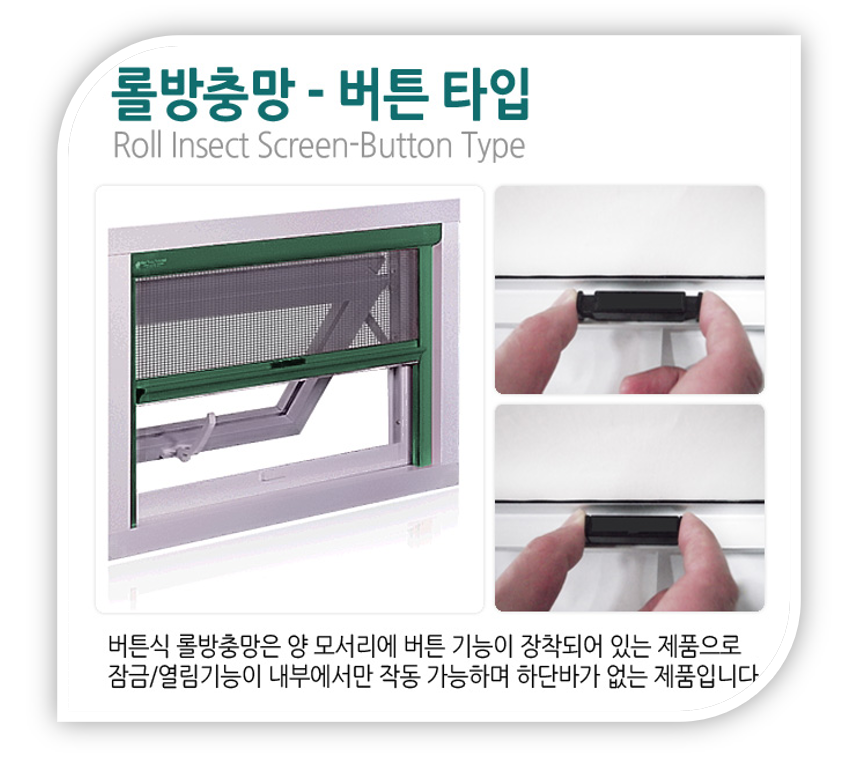 롤 방충망 중에서도 버튼 타입이 있는데, 아래 사진을 참고시면 되며, 이번 블로그에서 고장 수리 방법을 설명 하겠습니다.