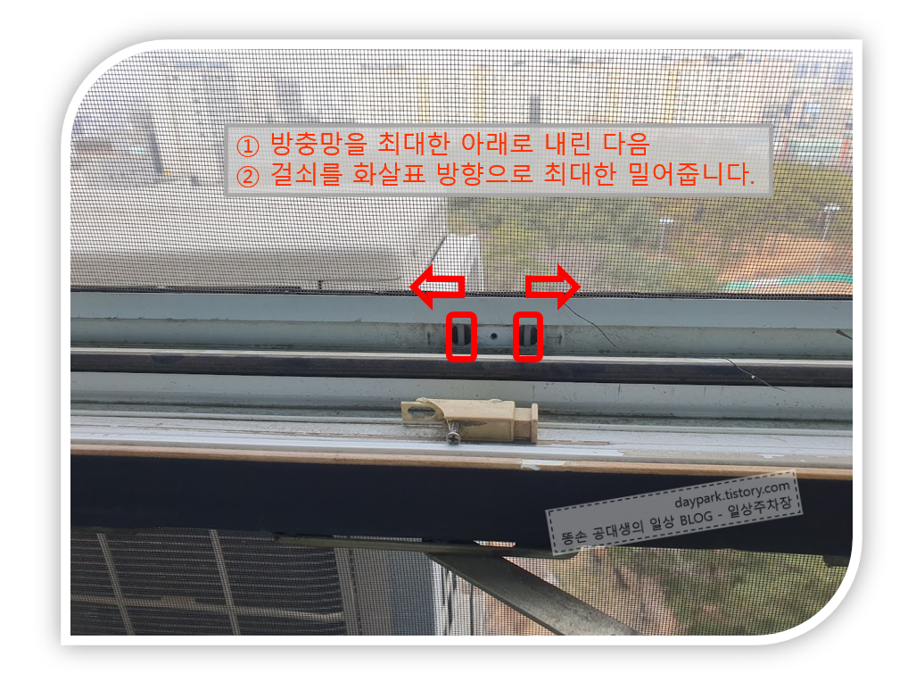 나) 버튼을 떼어내면, 내부의 걸림쇠가 보입니다. 방충망을 최대한 내린 상태에서, 걸림쇠를 양쪽으로 밀어주면 방충망이 고정됩니다.