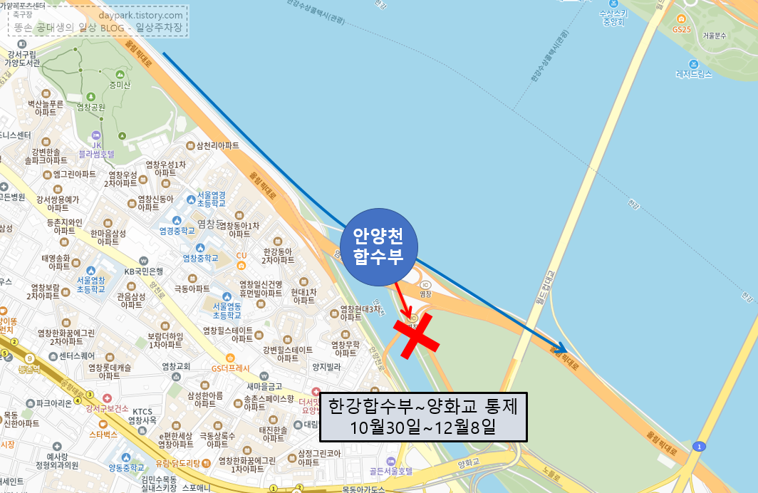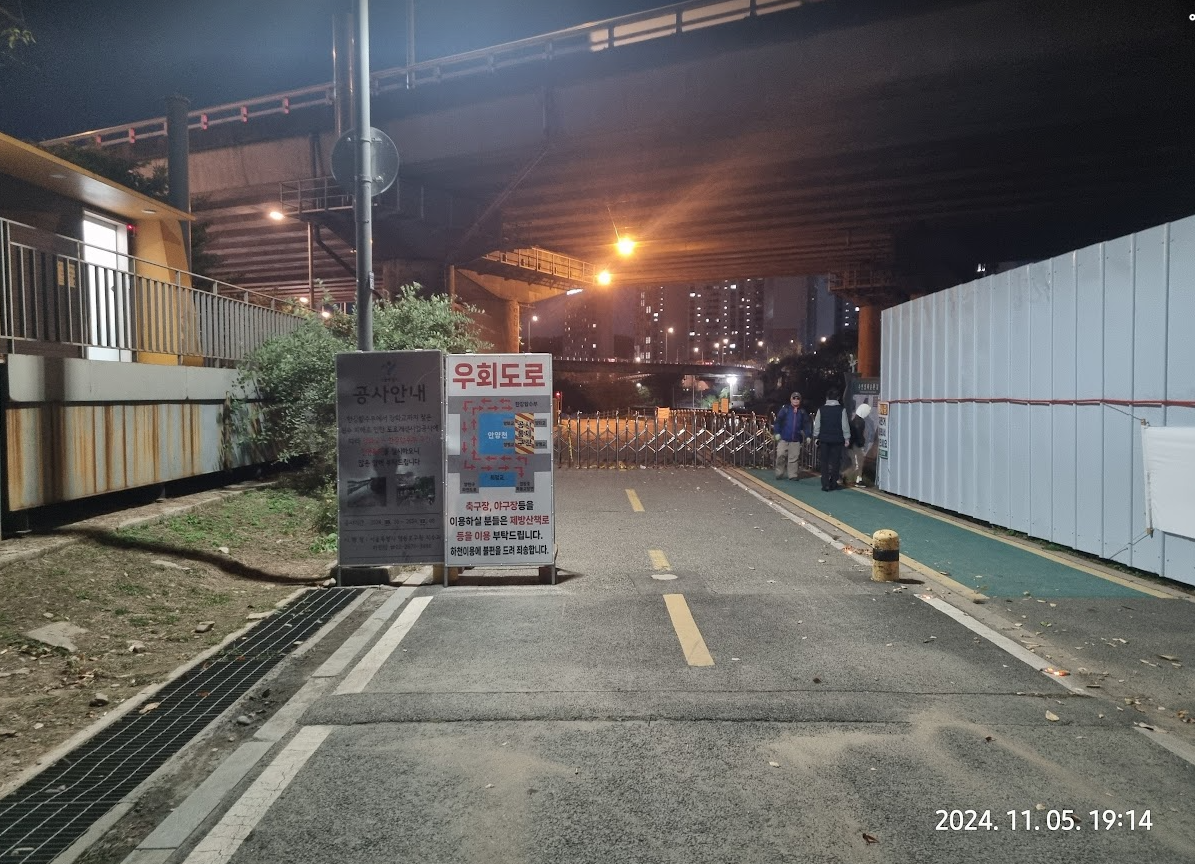 퇴근길에 한강변을 따라 안양천로를 통해 오목교로 들어옵니다. 이상하게 오늘은 사람이 없고 씽씽 달리더군요. 신나게 달려오다 보니, 한강에서 안양천으로 통하는 안양천 합수부에서 안양천으로 가는 길이 공사중으로 막혀있는 것을 발견하였습니다. 공사는 2024년 10월 30일부터 2024년 12월 8일까지 한다고 합니다.