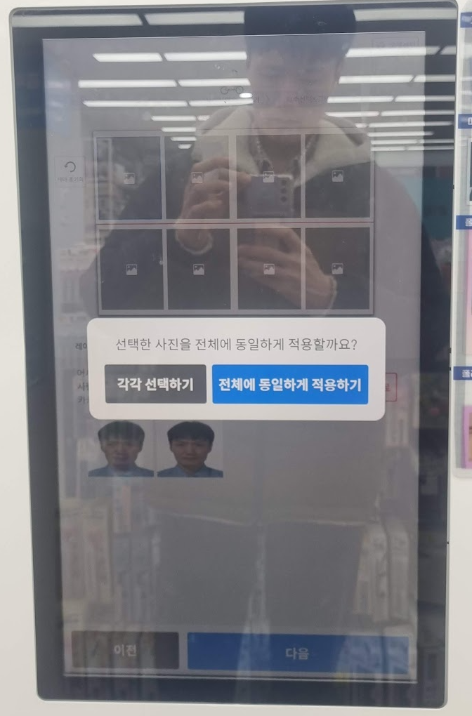 사진 하나를 선택하고 '전체에 동일하게 적용하기'를 누를 수 있고, '각각 선택하기'를 눌러서 원하는 사진을 출력하고자 하는 갯수만큼 터치하여 적용할 수 있습니다.