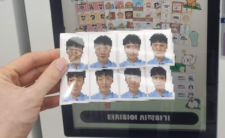다이소에 있는 스티커사진 제작기에서, 여권사진 또는 반명함 사진을 2,000원에 8장 뽑을 수 있습니다.