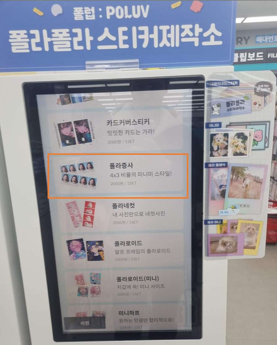 '폴라폴라 스티커제작소'에서 여권사진 또는 반명함 사진을 출력하려면, '폴라증사' 메뉴를 사용합니다.